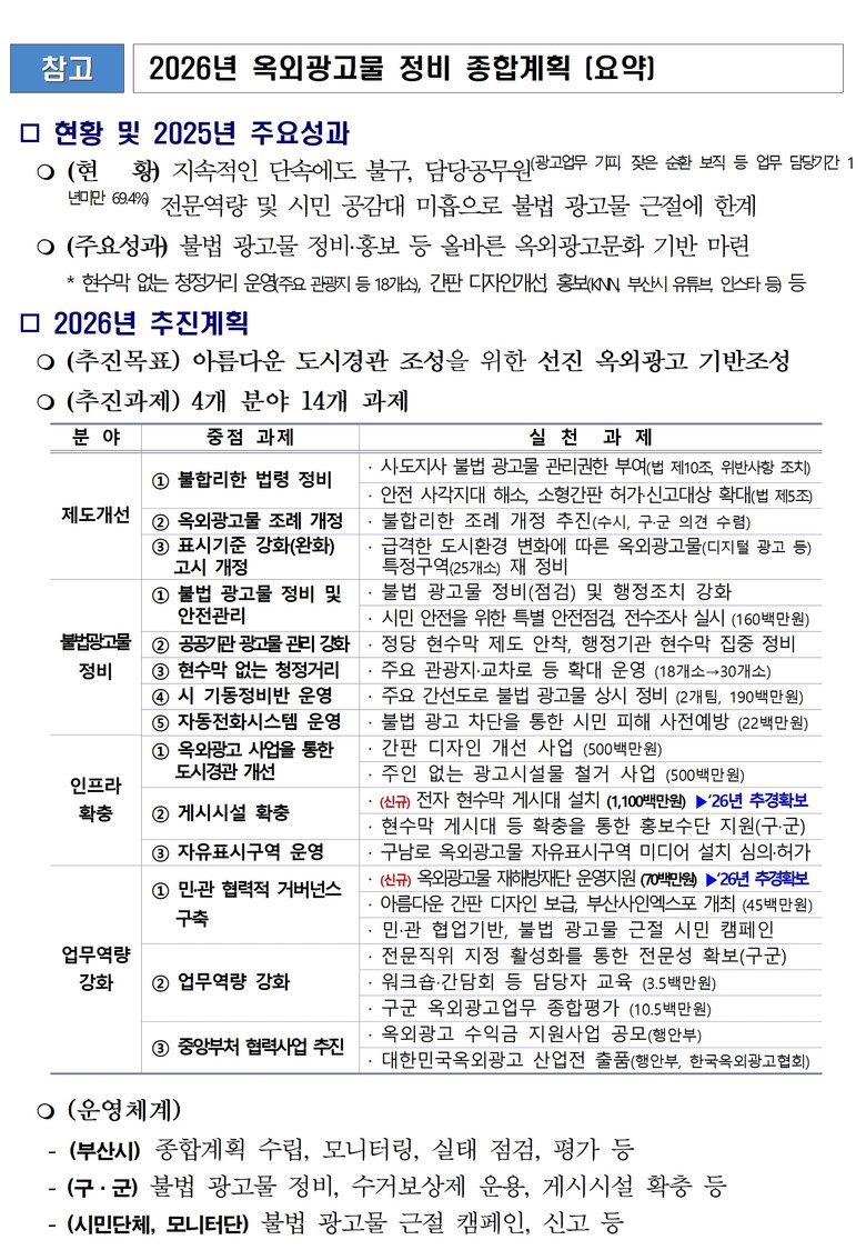 [부산 세계타임즈=이용우 기자] 부산시(시장 박형준)는 도시 이미지의 획기적인 개선과 불법 광고물 근절을 위해 민·관이 함께 참여하는 '2026년 옥외광고물 정비 종합계획'을 수립해 시행한다고 밝혔다.