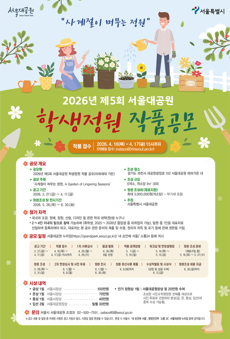 - 시민정원·학생정원 총 12개소 조성, 팀당 최대 300만 원 조성비 지원 [서울 세계타임즈=이장성 기자] 서울대공원은 시민이 직접 정원을 설계하고 가꾸며 정원문화를 확산하는 ‘2026년 제5회 시민참여정원 작품 공모전’을 개최한다.