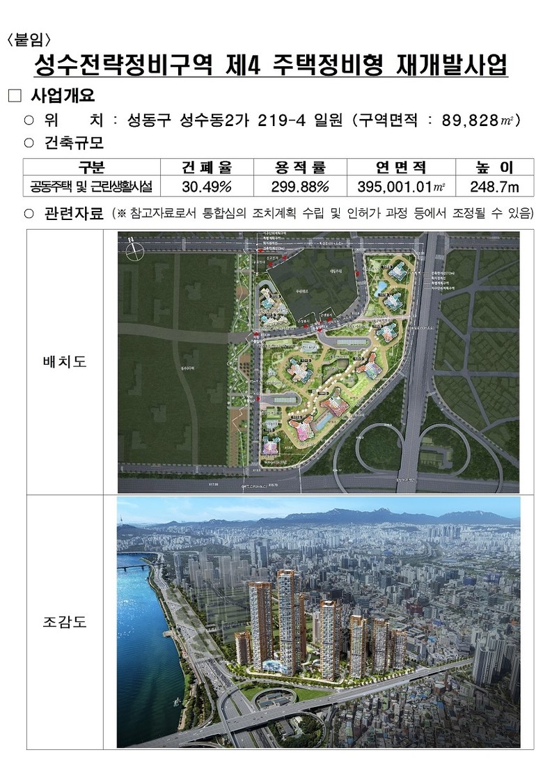 성수4지구의 초고층 아파트 건립에 따라 주동 형태는 구조적 안전성을 보완 계획할 것을 심의 시 조건 부여했다.